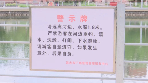 记者在滨湖河生态景观带看到,河岸边树立着严禁下水游泳等内容的警示牌,水域区的护栏上挂着备用救生圈。